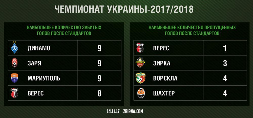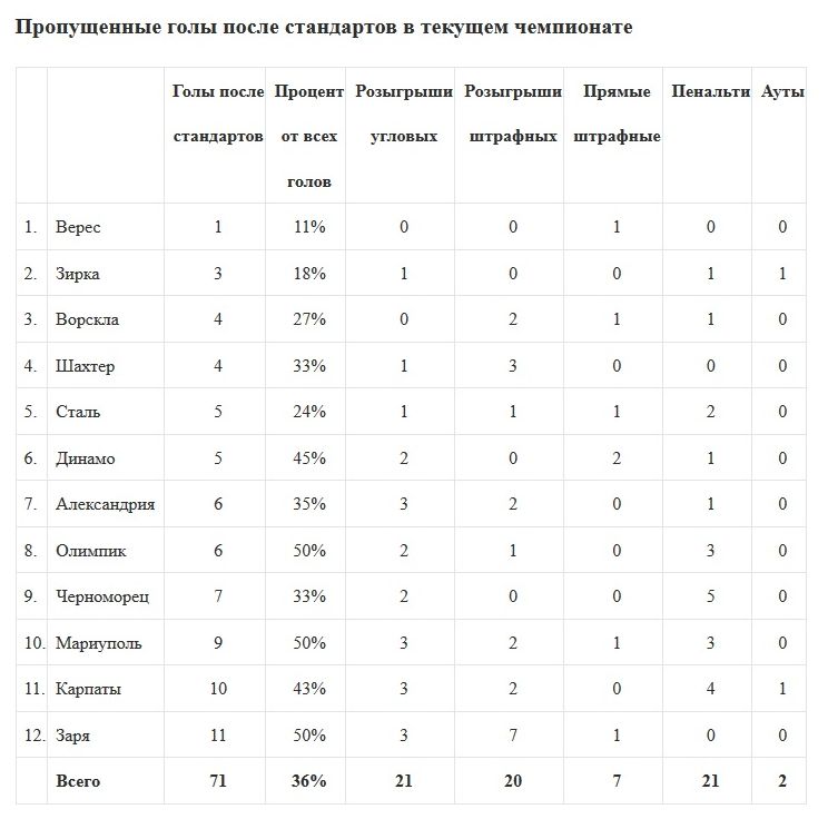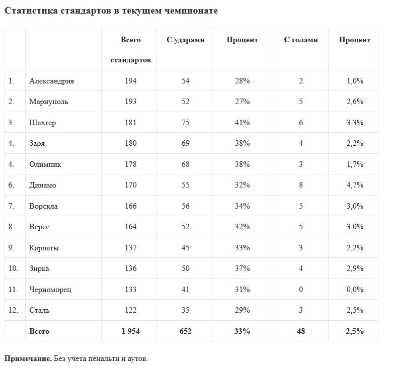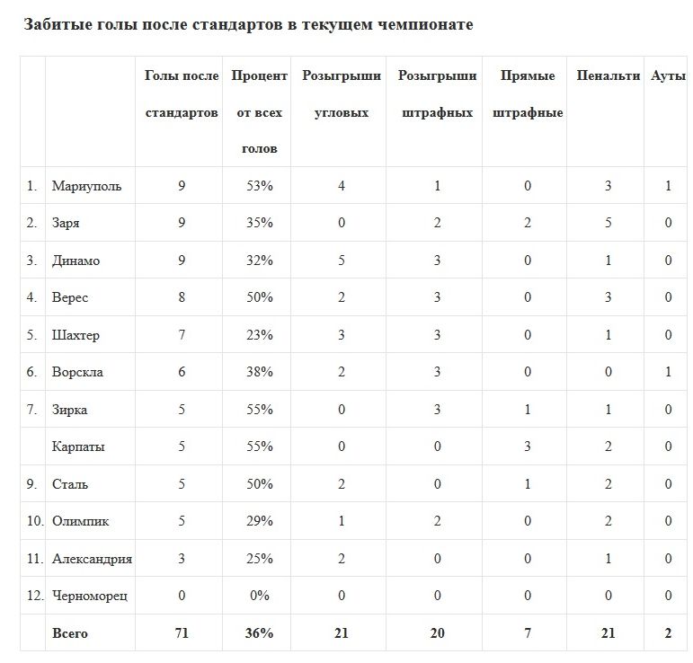 Впрочем, в атаке у Зари стандартные ситуации по-прежнему весьма опасны, и в этом мы могли убедиться и на международной арене, где по-другому луганчане, в общем-то, и не забивали. В УПЛ команда Юрия Вернидуба делит первое место по количеству голов после стандартов с Мариуполем и Динамо, которые, правда, сыграли на один матч меньше. В таблице мы, впрочем, отдельно расписали все виды стандартов — все-таки у некоторых команд сплошь и рядом трудовые голы, а кто-то часто забивает с пенальти…