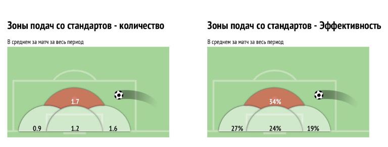 Вернемся к атакующим стандартам командам. Для того чтобы полностью оценить эффективность розыгрышей домашних заготовок, нужно посмотреть на их общее количество, число ударов по воротам и соотнести все это к забитым мячам. Начнем с того, что в УПЛ наибольшее количество подач выполняется в район 11-метровой отметки — оттуда чаще всего и бьют по воротам. На дальнюю штангу адресуют в два раза меньше мячей, чем на ближнюю, но пробить оттуда намного проще.
