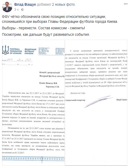 Экс-игрок «Динамо» и сборной Украины Владислав Ващук, который является кандидатом на пост главы Федерации футбола города Киева, сообщил, что выборы перенесены.