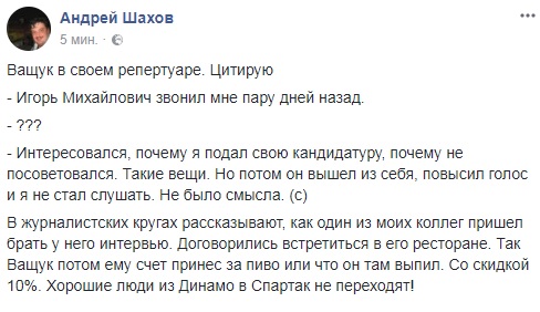 В журналистских кругах рассказывают, как один из моих коллег пришел брать у него интервью. Договорились встретиться в его ресторане. Так Ващук потом ему счет принес за пиво или что он там выпил. Со скидкой 10%. Хорошие люди из Динамо в Спартак не переходят! – написал Шахов на своей странице в Фейсбуке.
