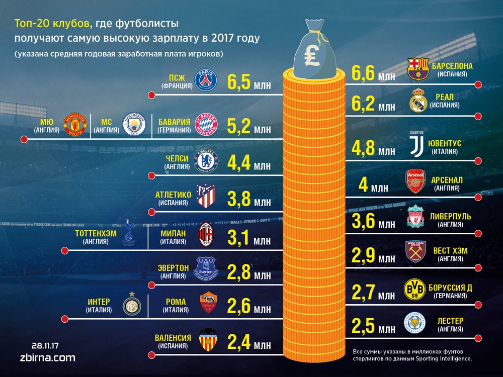Издание Sporting Intelligence обнародовало список из топ-20 клубов, игроки которых в среднем получают самую высокую зарплату в 2017 году, пишет zbirna.com.