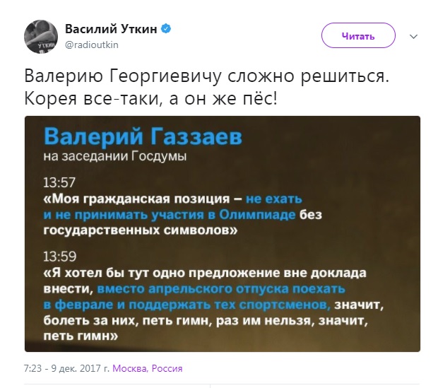 - Валерию Георгиевичу сложно решиться. Корея все-таки, а он же пёс! – написал Уткин на своей странице в Твиттере, прикрепив к сообщению скриншот.