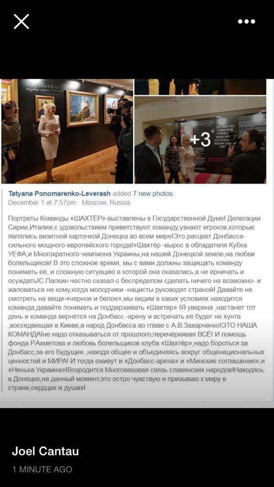 1 декабря на фейсбук-странице художника и помощника депутата Государственной Думы России Татьяны Пономаренко-Левераш было размещено сообщение о том, что портреты с изображениями игроков "Шахтера", Мирчи Луческу и Рината Ахметова выставлены в Государственной Думе России. Позже оно было скрыто, но нашей редакции удалось сохранить текст и фото.