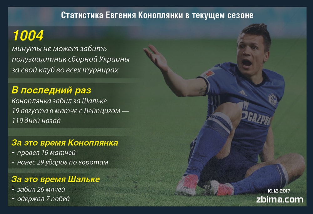 В последний раз Евгений Коноплянка отличился в составе Шальке еще 19 августа — 119 дней назад, пишет zbirna.com.