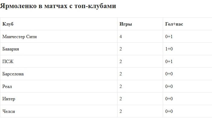 А еще хотим отметить очередное достижение Ярмоленко. Мы обратили внимание на тот факт, что Андрей впервые в карьере отличился в матче с европейским грандом. Понятно, что такой ярлык на команды мы повесили по своему видению, и кто-то может не согласиться с отсутствием в приведенном ниже списке Эвертона, Тоттенхэма, Порту и даже Шахтера…