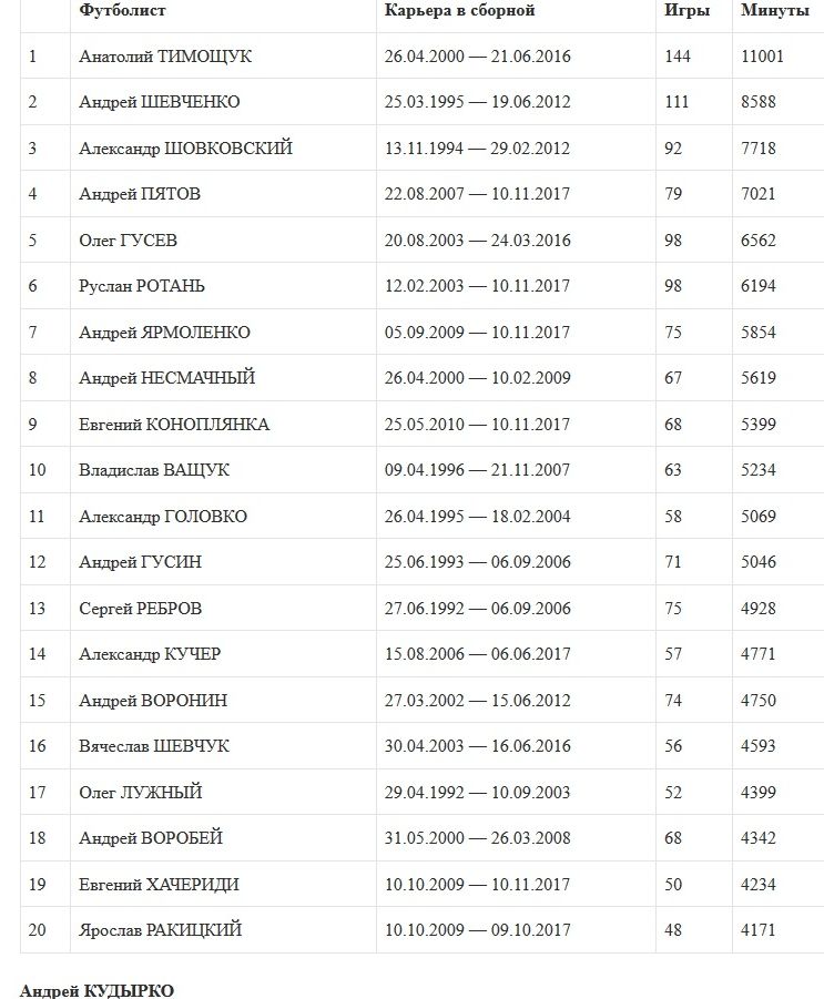 Руслан Ротань уже не в том возрасте, чтобы фантазировать. Андрею Пятову нужно провести еще 45 полных матчей, чтобы догнать Тимощука по объему времени, но потребуется еще 20, чтобы сравняться по количеству игр. Андрею Ярмоленко нужно 58 матчей и еще 11 сверху, чтобы превзойти рекордсмена по обоим показателям.