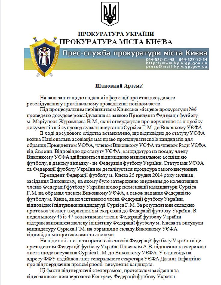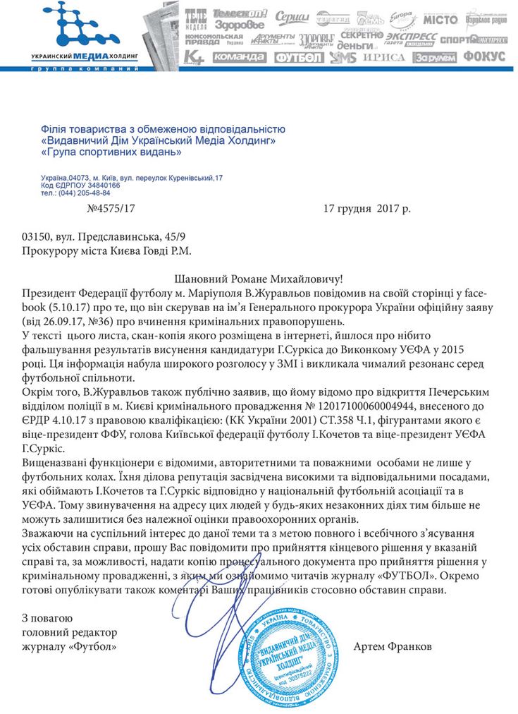 «Первый документ – запрос, второй – ответ, – пишет главный редактор издания Артем Франков. – Ответ столичной прокуратуры на официальный запрос редакции журнала «Футбол» по поводу скандального обвинения почетного президента ФФУ, вице-президента УЕФА Григория Суркиса, что он, дескать, фальсифицировал результаты голосования регионов за свое повторное выдвижение в члены исполкома УЕФА. Собственно, Европейский союз футбольных ассоциаций уже привык, что после феерического Евро-2012 в Украине появились совсем другие мастера «пофеерить». Подозреваю, в Ньоне до сих пор недоумевают, перечитывая бредни мариупольского футбольного вожака Василия Журавлева. Но, уверен, еще большее недоумение вызывает у европейских функционеров поведение руководства национальной федерации, которая не только не прекратила этот «цирк на дроті», но и всячески потакала наемному клоуну своим бездействием – в чем вижу и свою вину как члена исполкома. Видите ли, у ФФУ не оказалось нужных документов… Почему не оказалось – это отдельная тема для разговора.
