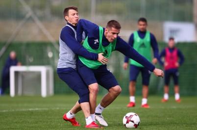 Вечернее занятие было исключительно игровым. После небольшой разминки игроки приступили к упражнению на контроль мяча, после чего сыграли двусторонку на все поле.