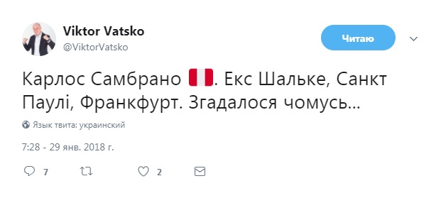 - Карлос Самбрано. Екс Шальке, Санкт Паулі, Франкфурт. Згадалося чомусь... – написал Вацко.
