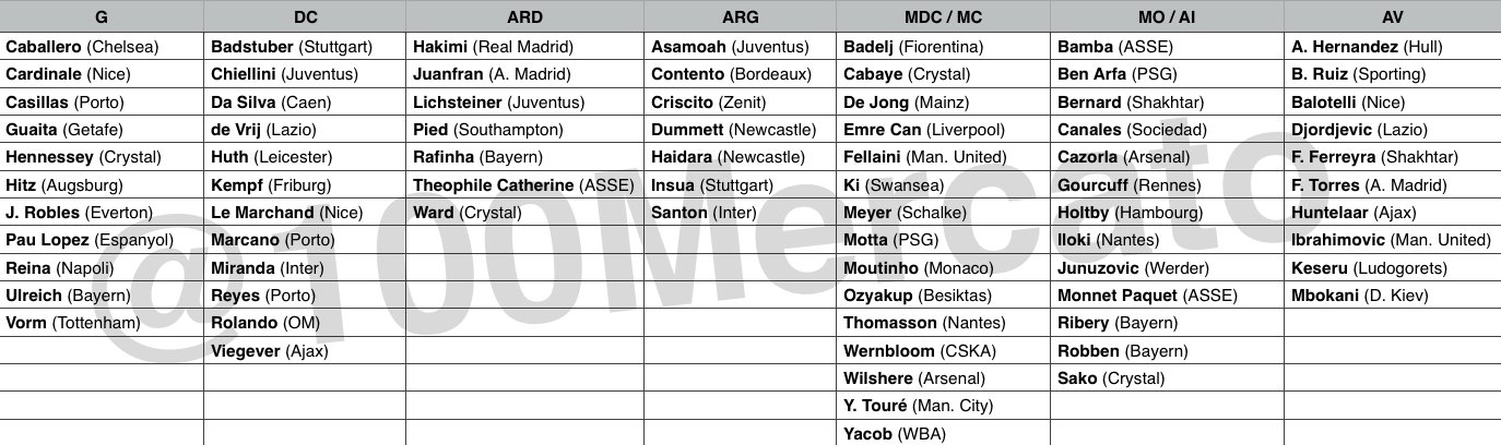 На позиции нападающего также есть два игрока, которые ныне бороздят просторы чемпионата Украины — Дьемерси Мбокани из «Динамо» и Факундо Феррейра из «Шахтера». Они находятся в компании таких исполнителей, как Фернандо Торрес («Атлетико»), Златан Ибрагимович («Манчестер Юнайтед»), Марио Балотелли («Ницца») и Клас-Ян Хунтелар («Аякс»).