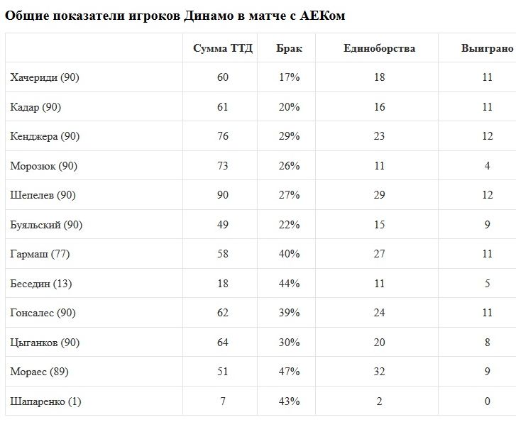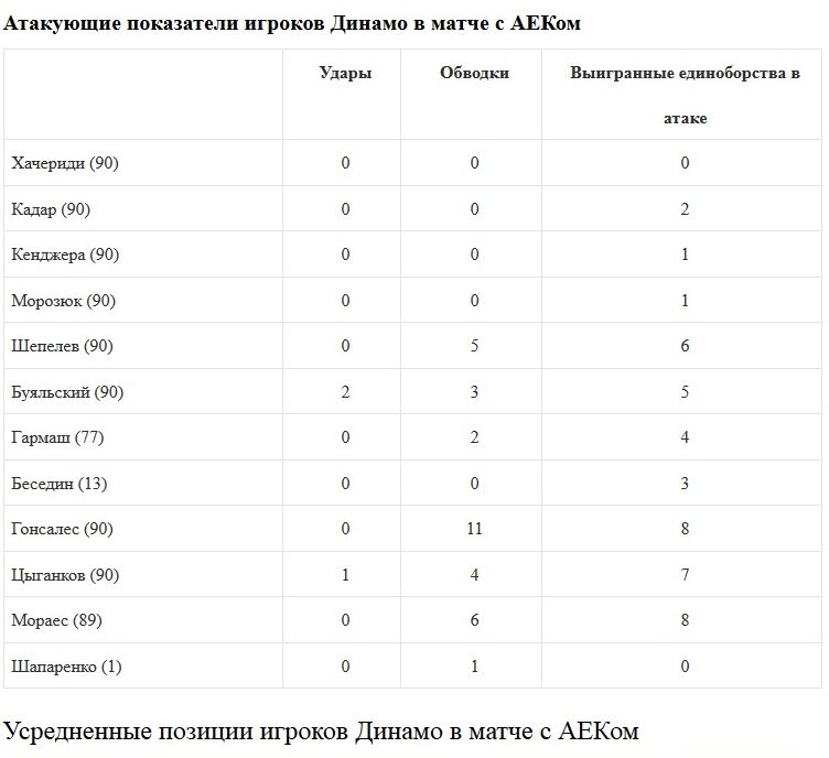 Защитники Динамо проиграли в Афинах 30 единоборств, полузащитники отдали всего 10 острых передач, а нападающие ни разу не пробили по воротам. Пытаясь повысить общую игровую компактность, средняя линия слишком глубоко садилась к своим воротам, хотя это во многом зависит от защитников. Во втором тайме киевляне вообще не могли наладить контригру. Отбивались, как могли, но отстоять ворота так и не сумели.