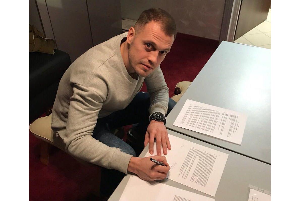 Сегодня футболист успешно прошел медосмотр, после которого подписал контракт и в компании с Игорем Перебейносом, представителем General football group, попозировал с футболкой своей новой команды.