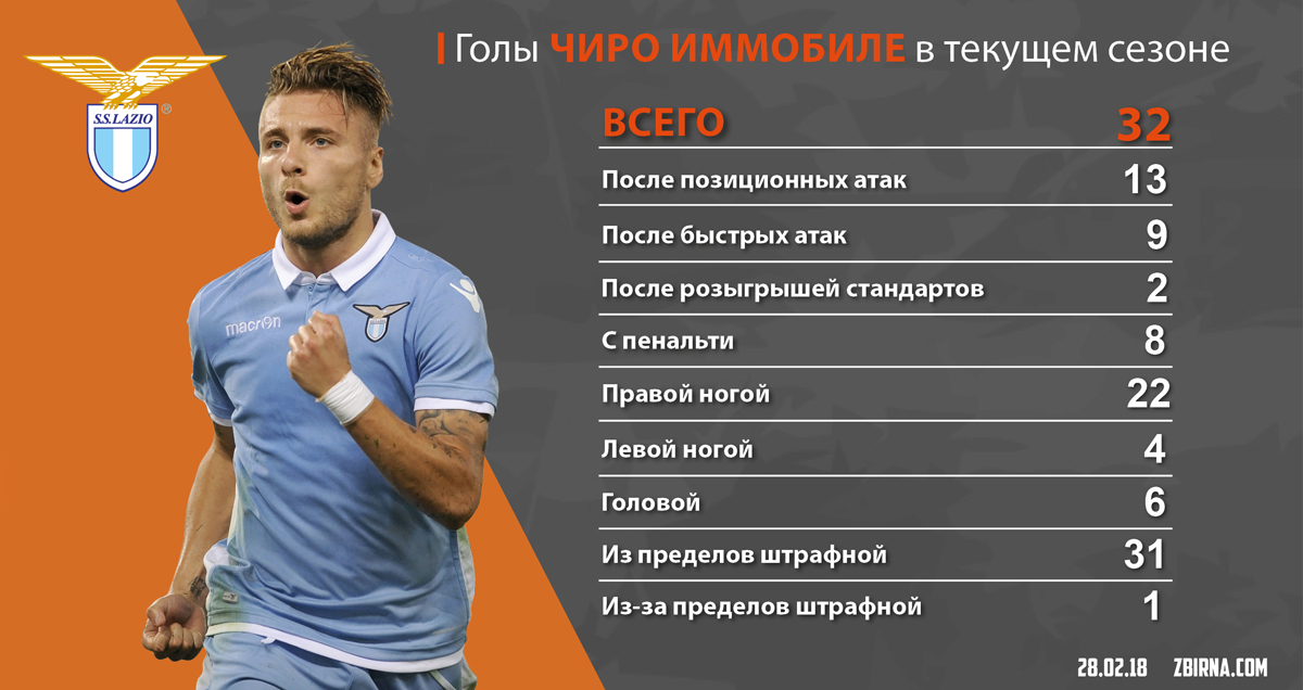 В текущем сезоне форвард итальянского Лацио Чиро Иммобиле забил уже 32 мяча во всех официальных турнирах, а это второй результат среди всех футболистов, выступающих в пятерке ведущих европейских чемпионатов, пишет zbirna.com. Больше голов только у нападающего Тоттенхэма Гарри Кейна — 35. У Криштиану Роналду, к примеру, — 31, а у Лионеля Месси — 30. Такую вот атакующую машину уже в ближайшее время попробует остановить оборона Динамо. Как это лучше сделать, решать тренерам команды, а мы со своей стороны можем лишь отметить определенные бомбардирские особенности итальянца. Хотя таковых, по большому счету, и нет…