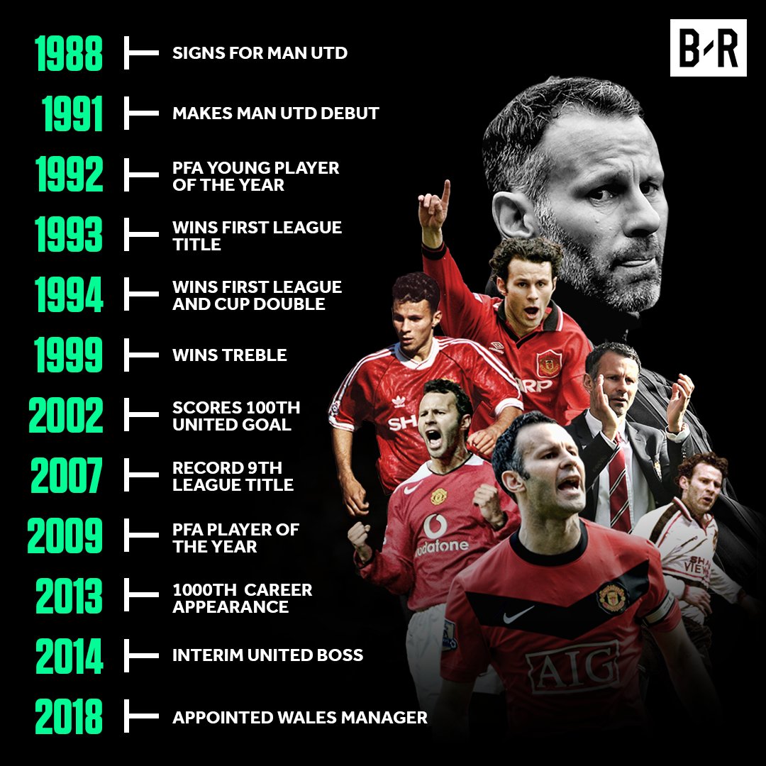 Валлийский полузащитник провёл 896 матчей за "красных дьяволов", забил 155 голов и сделал 158 ассистов.