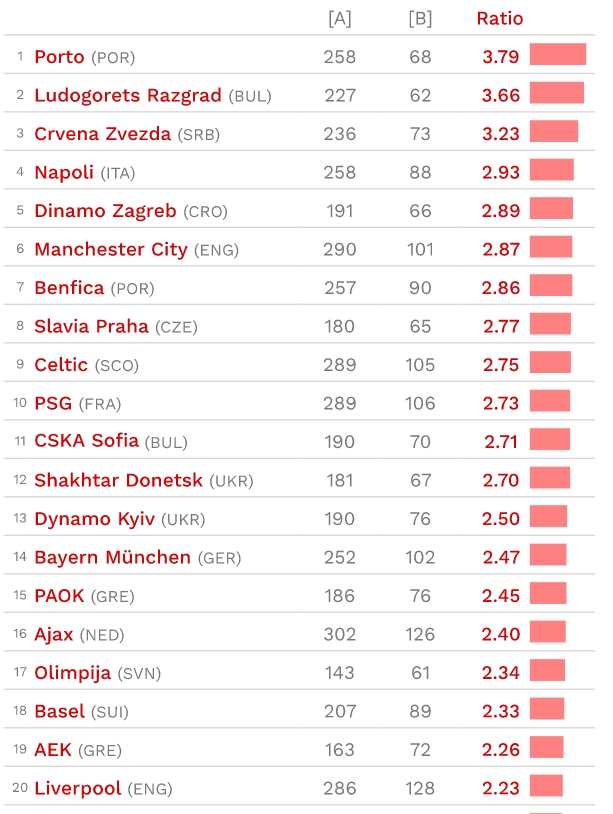Возглавил список португальский гранд «Порту», который в этом чемпионате ударил по воротам соперника 258 раз, из которых 68 пришлись в створ ворот. Соотношение ударов «драконов» составляет 3.79.