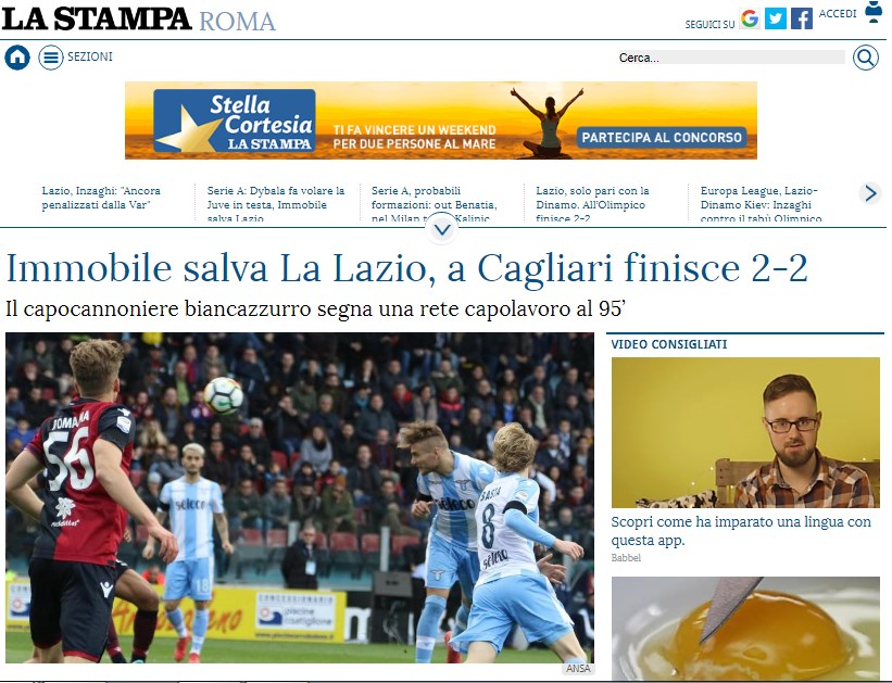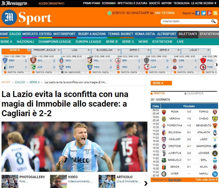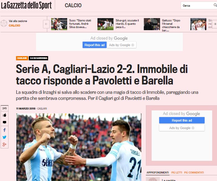 «Бьянко-челести сыграли чрезвычайно пассивно, что не характерно для этой команды. Сказывается участие Лацио в играх Лиги Европы, в которых Орлы тратят немало сил. После мяча Бареллы, казалось, Кальяри отпразднует заслуженную победу умопомрачительный удар Иммобиле пяткой, перевернул ситуацию с ног на голову», — подытоживает таблоид.