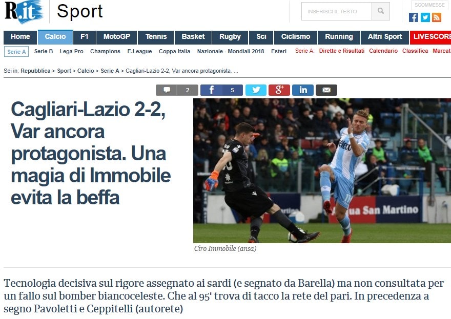 La Gazzetta dello Sport отмечает: «Чиро Иммобиле спас Лацио от неминуемого поражения в Кальяри, забив редчайший по красоте мяч. Его удар на последней минуте — настоящая жемчужина футбольного искусства».