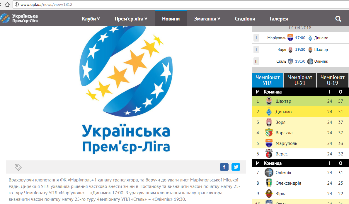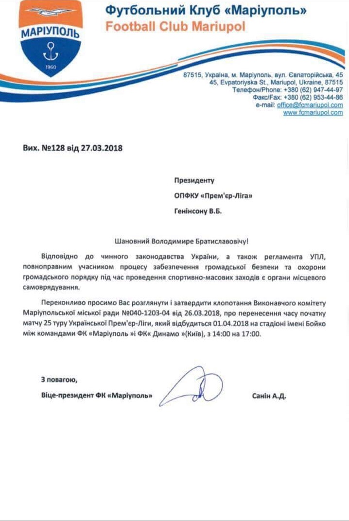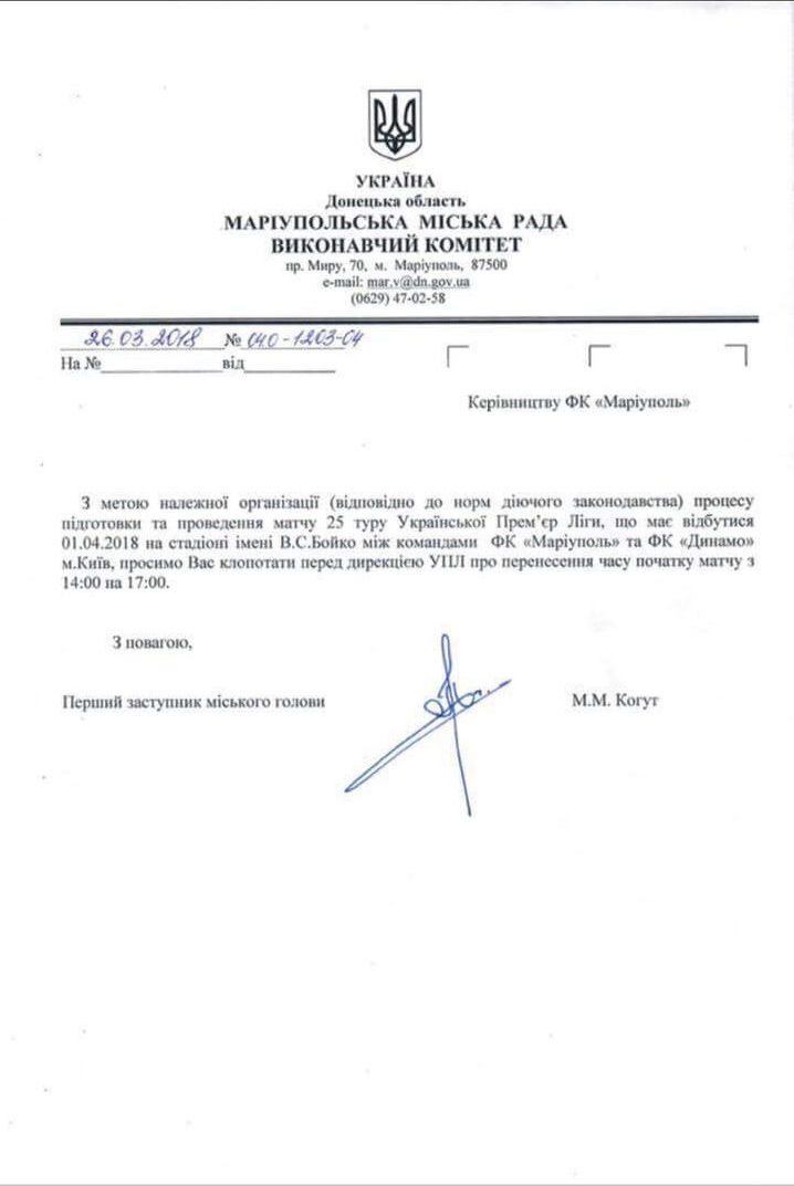 Дирекція УПЛ щодо виправдання свого ганебного рішення про перенесення часу початку матчу Маріуполь – Динамо послалася на запит від Маріупольської міської ради та ФК Маріуполь.