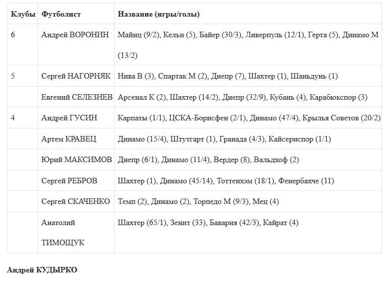Футболисты, представлявшие в сборной Украины наибольшее количество клубов