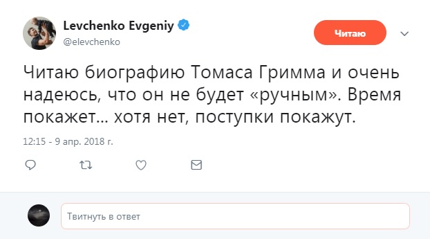 - Читаю биографию Томаса Гримма и очень надеюсь, что он не будет «ручным». Время покажет... хотя нет, поступки покажут, - написал Левченко на своей странице в Твиттере.