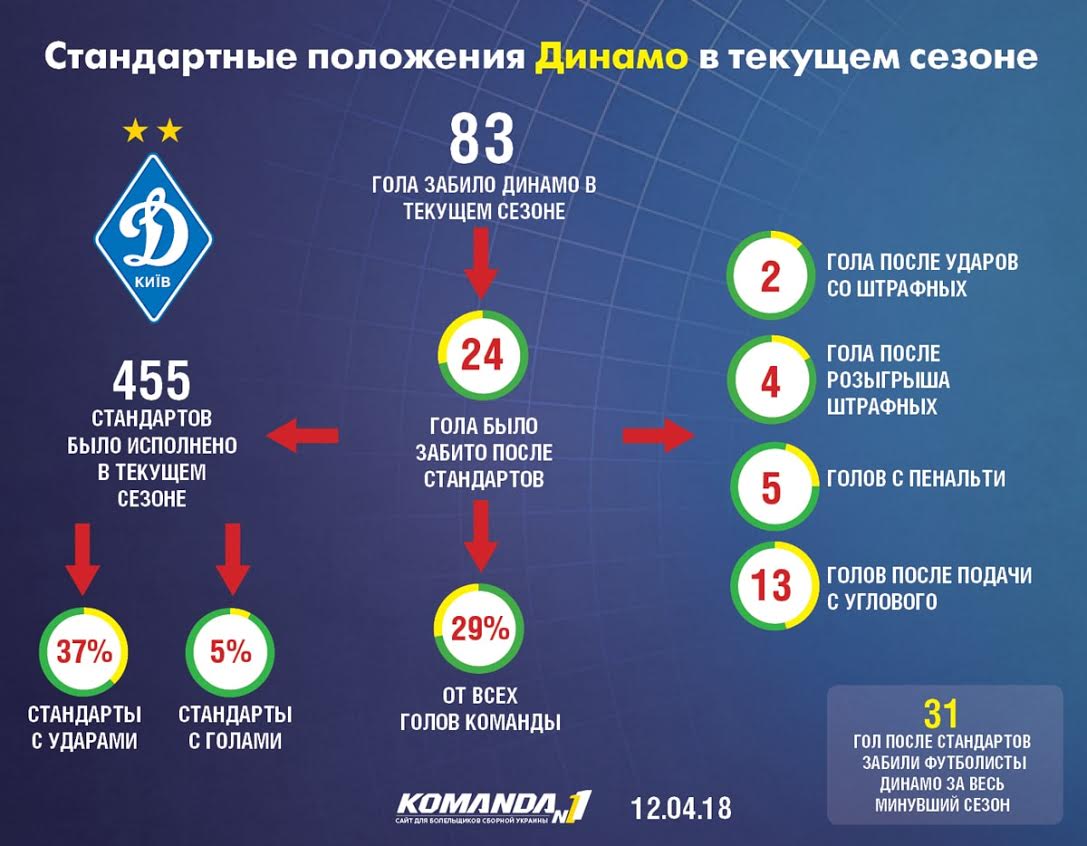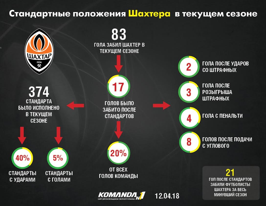 Средняя длительность голевых атак Шахтера в этом сезоне почти в полтора раза превышает время, которое уходит у Динамо на один гол, пишет zbirna.com. Комбинационный стиль горняков по достоинству оценили даже в Лиге чемпионов, а забитые мячи киевлян по большей части носят стихийный характер — контратака, рикошет, добивание и так далее. Впрочем, в чем точно команда Александра Хацкевича превосходит лидера чемпионата, так это в количестве голов, забитых после стандартов. Таких результативных ударов у Динамо в текущем сезоне набралось уже 24, а у Шахтера — 17.