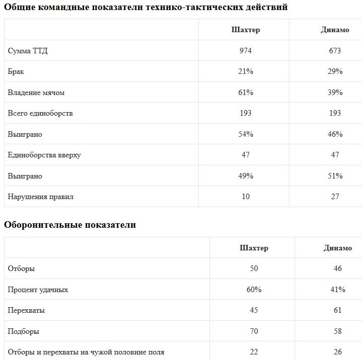 Уступив сопернику во времени владения мячом (61% на 39%), киевляне не отсиживались у своих ворот, а совершили 10 удачных отборов и 16 перехватов на чужой половине поля. У горняков таких действий было меньше (всего 22), хотя они проводили возле штрафной площади Динамо гораздо больше времени. Такая плотная и компактная игра бело-синих лишила противника его козырей — оранжево-черные провели всего восемь быстрых атак. У гостей было 17 подобных выпадов. По такой игре, пожалуй, это самые главные цифры, а если и дальше смотреть на КПД в наступательной фазе, то в ударах по воротам, в острых передачах динамовцы своему противнику не уступили. Даже обводок у них было больше, хотя исполнение порой подводило. Впрочем, главной задачей футболистов Динамо было нейтрализовать лидеров Шахтера, и с ней они, в общем-то, справились. Ключевым стало желание игроков работать на команду. В то время как квартет атакующих исполнителей горняков только 16 раз вступал в оборонительные единоборства и выиграл три (!) такие дуэли, у их столичных коллег было 26 подобных действий и 10 из них оказались удачными. Таким был в этом матче прессинг двух коллективов.