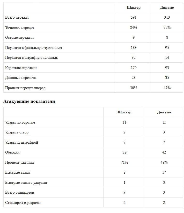 В Шахтере, кажется, все признали, что Динамо победило по делу, и на этот раз там никто не станет обращать внимание на то, что команда превзошла соперника на три сотни технико-тактических действий. Такое преимущество во многом обусловлено большой разницей в передачах мяча, но их точность была у горняков не на самом высоком уровне — даже в Лиге чемпионов оранжево-черные не допускали столько ошибок. У динамовцев брак оказался еще выше, но команда Александра Хацкевича построила свою игру в расчете на молниеносные выпады.