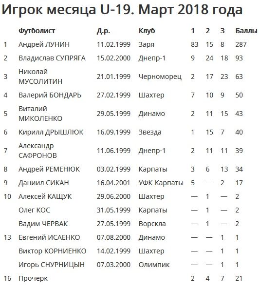 В марте только один Андрей Лунин из украинских футболистов 1999 года рождения и моложе стабильно играл за основной состав своего клуба в топ-дивизионе. Остальные либо подыгрывали, либо все еще выступают за молодежные составы. Поэтому огромное превосходство Лунина, в марте ставшего самым юным вратарем в истории национальной команды Украины, над ближайшим конкурентом не должно удивлять.