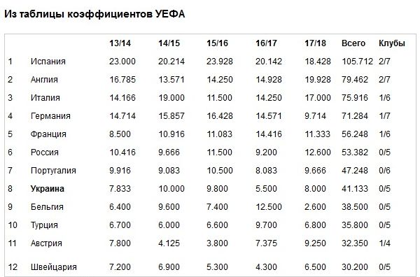 Напомним, что показатель Украины в таблице коэффициентов УЕФА по итогам пятилетнего цикла сформировался после вылета из еврокубков Шахтера и Динамо. Он составляет 41,133 балла и позволил занять восьмое место. А оно в свою очередь даст право делегировать в еврокубки-2019/2020 пять клубов: два – в Лигу чемпионов (один будет в групповом раунде, один – в третьем квалификационном) и три – в Лигу Европы (один – в групповом раунде, один – в третьем квалификационном и один – во втором).