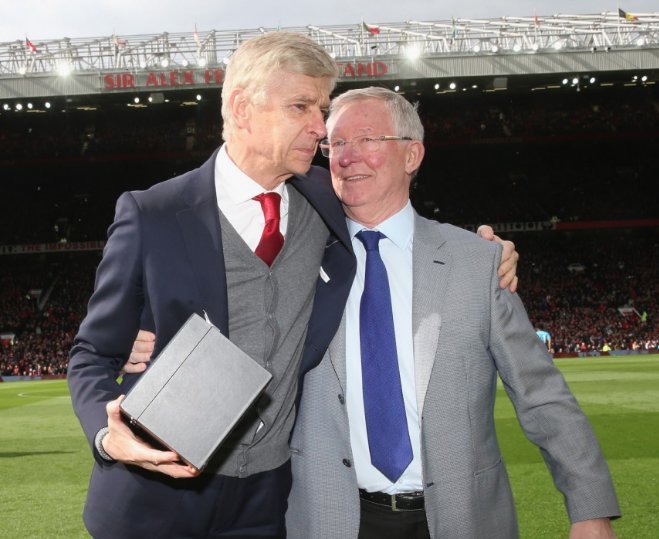 Бывший тренер «Манчестер Юнайтед» сэр Алекс Фергюсон презентовал наставнику «Арсенала» Арсену Венгеру сувенир в честь выхода француза на пенсию.
