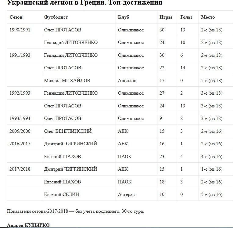 Несмотря на то, что первый украинский легионер в элитном дивизионе чемпионата Греции появился еще в сезоне-1990/1991, только спустя 28 лет мы получили первого чемпиона этой страны. Близко к титулу подбирались наша знаменитая пара — Геннадий Литовченко и Олег Протасов, которых в Пирей пригласил главный тренер Олимпиакоса Олег Блохин. Но в 1991 году Панатинаикос оказался впереди на восемь очков, а в 1992-м АЕК — на три.