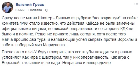 После этого в ФФУ будут говорить, что все клубы находятся в равных условиях? Как игра с Шахтером, так у них оперативность. Как игра с Ворсклой, так спешить не надо. Некрасиво и непорядочно, - написал Гресь на своей странице в Фейсбуке, прикрепив к сообщению скриншот из интервью представителя КДК ФФУ по ситуации с защитником "Зари" Сватком.