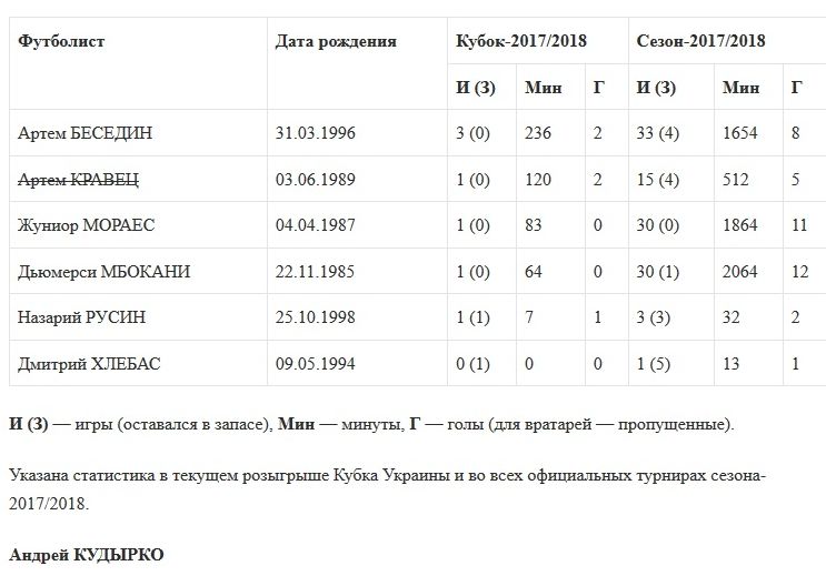 Зимой в Турцию уехал Кравец, а потом возникли проблемы с местом в составе у Мораеса и Мбокани. У каждого — свои. Мораес последний раз выходил на поле 14 апреля — на девять минут. А Мбокани в 2018 году ни разу не сыграл больше одного тайма и ни разу не попал в стартовый состав. Всего 13 минут провел на поле после возвращения из аренды Хлебас. Только однажды оказался в протоколе матча (кубкового — в Днепре) 19-летний Русин. Роль основного форварда досталась Беседину, который с 18 марта по 22 апреля забил шесть мячей. Но в двух последних поединках (Ворскла — 1:0, Мариуполь — 1:1) он уходил с поля без голов.