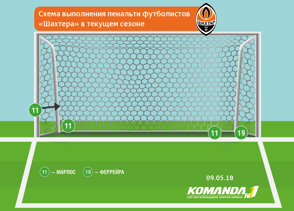 В Шахтере главный мастер пенальти — Марлос. За последние четыре года он забил 11 раз из 13-ти, причем в левый от себя угол пробивал только дважды. Шесть раз в течение этого времени подходил к точке Алан Патрик — реализация составила 67%. Три из трех пенальти забил Факундо Феррейра, по два из трех — Тайсон, Фред и Тарас Степаненко. Получается, что определить пятерку пенальтистов горняков не так уж и сложно. Хотя это все, повторюсь, теория.