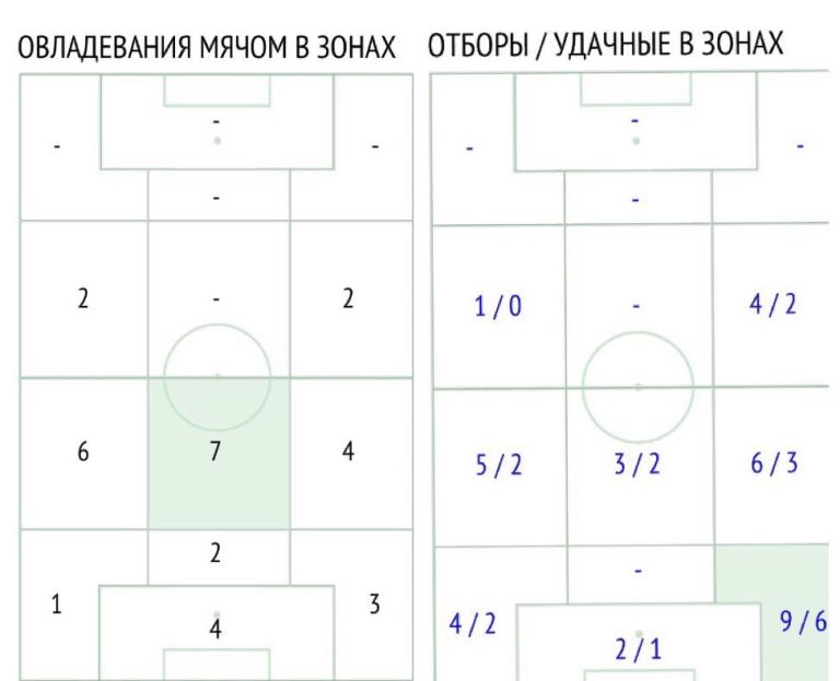 Николай Шапаренко. В первом тайме был заметной фигурой на поле, но действовал как-то эпизодически. С одной стороны, каждый четвертый пас отдавал в финальную треть поля, нанес два удара по воротам, но с другой, совершил лишь одну обводку, выиграл три единоборства из девяти, сделал один удачный отбор из трех, не выполнил ни одного перехвата и трижды подобрал мяч. В итоге за 61 минуту получилось 36 ТТД, а брак составил 39%.