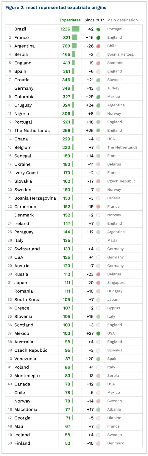 За даними Міжнародного центра спортивних студій, сьогодні у світі 12425 гравців виступають за межами своїх Батьківщин. Найбільше з них — 1236 — бразильців. Громадяни нашої держави займають у цьому списку місце №17: за рубежем виступають 182 українські футболісти.