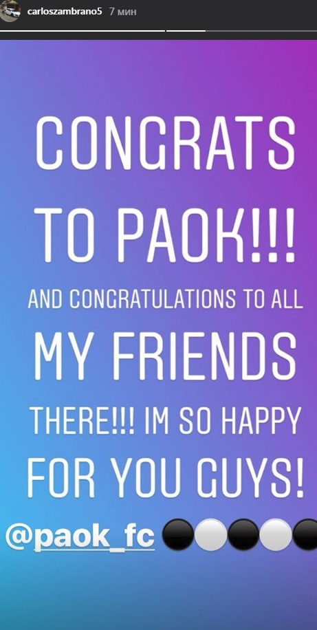 - Поздравляю ПАОК! И мои поздравления всем друзьям оттуда! Я очень счастлив за вас, ребята, - написал Самбрано на своей странице в Инстаграме.