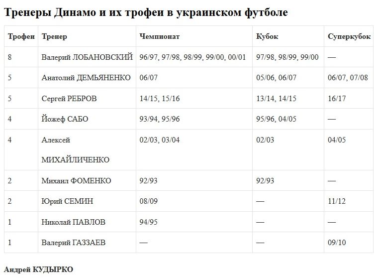 Больше игр из числа тренеров, не добывших с Динамо ни одного титула, провел только Олег Блохин — 65. Третий в этом грустном рейтинге — Анатолий Пузач (45).
