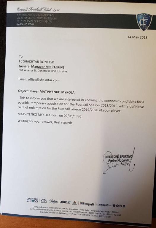 Как уже сообщала КОМАНДА1, итальянский Эмполи всерьез заинтересован в приобретении защитника Шахтера и сборной Украины Николая Матвиенко. В офис донецкого клуба уже пришел соответствующий документ на имя генерального директора Сергея Палкина. В нем итальянцы официально подтверждают свои намерения обсудить с горняками вопрос аренды футболиста (сезон-2018/2019) с последующим правом выкупа (сезон-2019/2020).