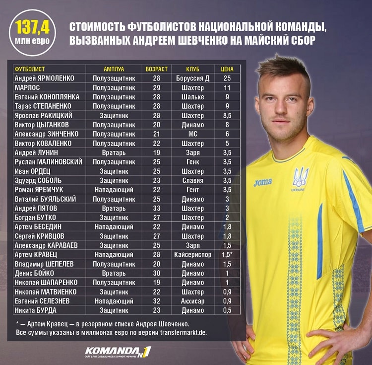 Согласно данным авторитетного transfermarkt.de, сегодняшний состав сборной Украины «тянет» на 137,4 миллиона евро, пишет zbirna.com.