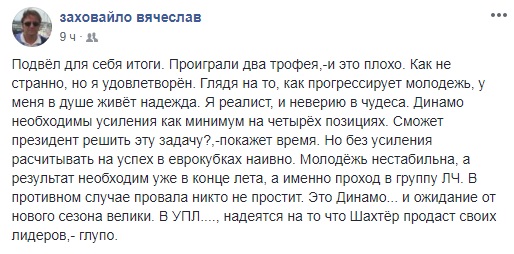 - Подвёл для себя итоги. Проиграли два трофея, - и это плохо. Как не странно, но я удовлетворён. Глядя на то, как прогрессирует молодежь, у меня в душе живёт надежда. Я реалист, и не верю в чудеса. Динамо необходимо усиление как минимум на четырёх позициях. Сможет президент решить эту задачу?, - покажет время. Но без усиления рассчитывать на успех в еврокубках наивно. Молодёжь нестабильна, а результат необходим уже в конце лета, а именно проход в группу ЛЧ. В противном случае провала никто не простит. Это Динамо... и ожидание от нового сезона велики. В УПЛ...., надеяться на то что Шахтёр продаст своих лидеров,- глупо, - написал Заховайло на своей странице в Фейсбуке.