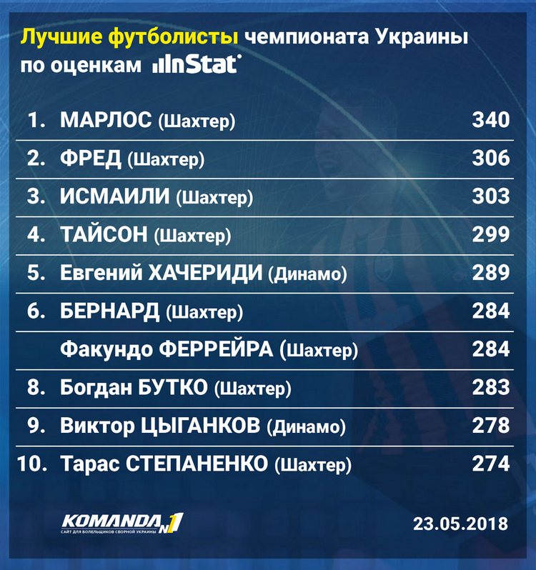 Цыганков и Хачериди в ТОП-10 лучших игроков чемпионата Украины в сезоне 2017/18 по версии InStat