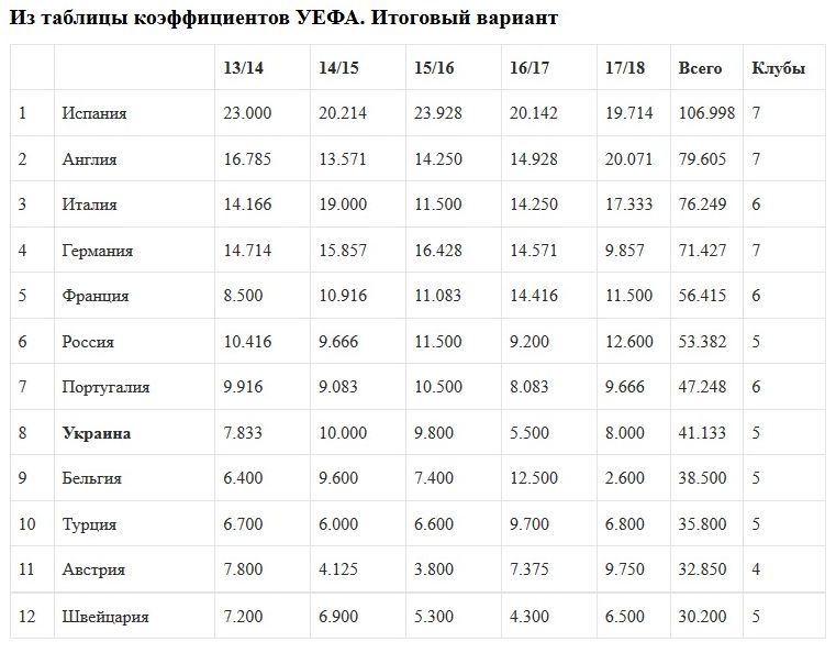 Таблица коэффициентов УЕФА. Итоговый расклад: четверо - за горизонтом