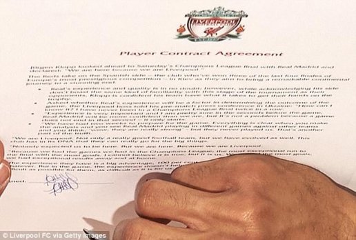 24-летний бразилец поставил подпись на листе бумаги с эмблемой Ливерпуля и надписью "Контракт игрока". Однако текст под этим "соглашением" был распечатанной пресс-конференцией Юргена Клоппа с финального матча Лиги чемпионов против Реала, пишет Daily Mail.