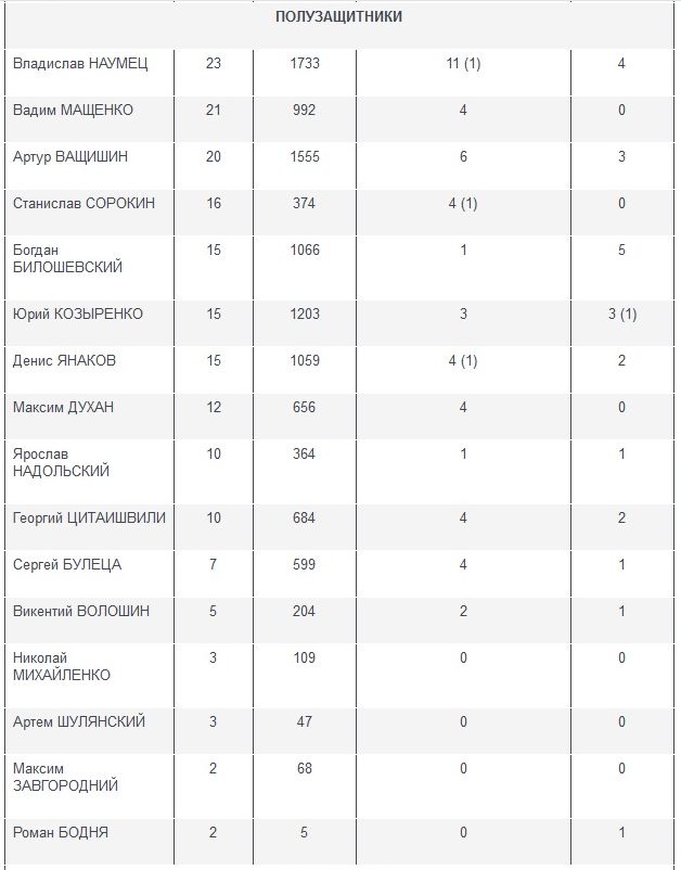 по 4 – Булеца, Цитаишвили, Духан, Янаков, Сорокин, Мащенко