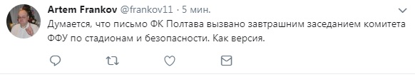 - Думается, что письмо ФК Полтава вызвано завтрашним заседанием комитета ФФУ по стадионам и безопасности. Как версия, - написал Франков на своей странице в Твиттере.