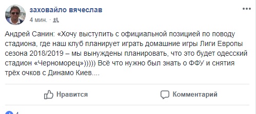 - Андрей Санин: «Хочу выступить с официальной позицией по поводу стадиона, где наш клуб планирует играть домашние игры Лиги Европы сезона 2018/2019 – мы вынуждены планировать, что это будет одесский стадион «Черноморец»))))) Всё, что нужно был знать о ФФУ и снятии трёх очков с Динамо Киев... – написал Заховайло на своей странице в Фейсбуке.