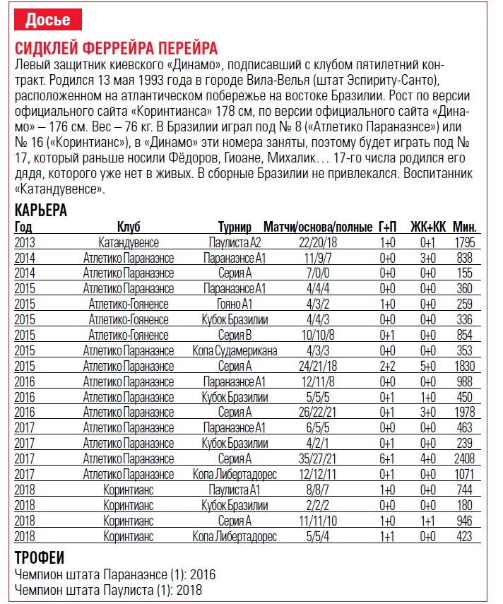Сидклей – еще более атакующий вариант Исмаили. Недаром почти всю концовку прошлого года Сидклей отыграл на фланге не в обороне, а ближе к атаке, флангового атакующего полузащитника при схеме 4–2–3–1. И немало матчей отыграл не слева, а справа! Например, против «Сантоса» в Кубке Либертадорес или против «Фламенго» в чемпионате. После перехода в «Коринтианс» все эксперименты с его позицией прекратились. Там он играл только левого защитника, играл стабильно. Именно из «Коринтианса» он и попал в «Динамо». «Коринтианс» взял его в аренду с правом «первой ночи». В том случае, если бы он повторил предложение «Динамо», остался бы там. Но, видно, денег не нашлось. То, что он много играл в различных бразильских и латиноамериканских турнирах, «Динамо» во благо, ведь это значит, что у него нет проблем с игровой практикой, да и форма его, судя по всему, хороша.