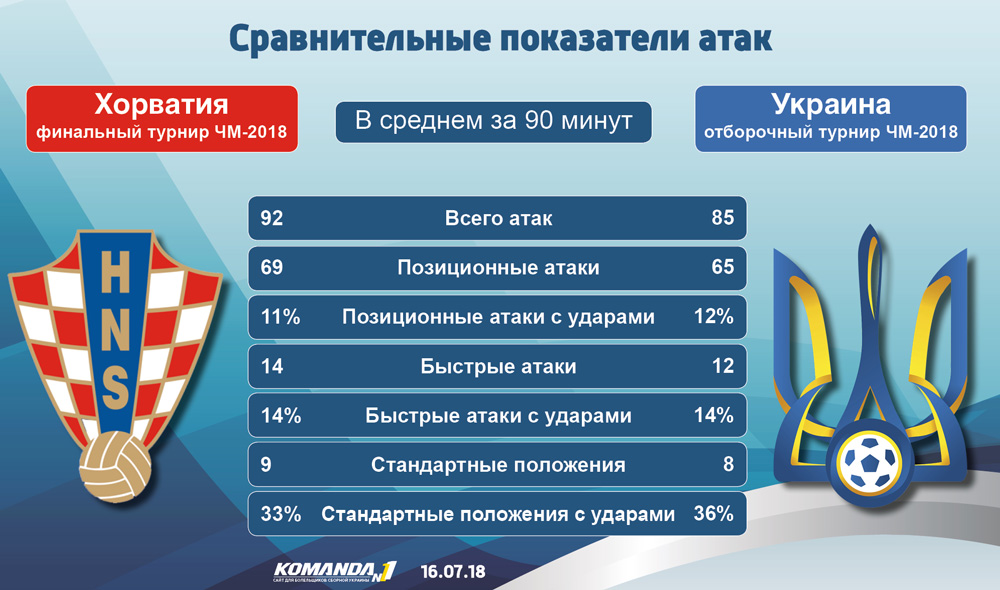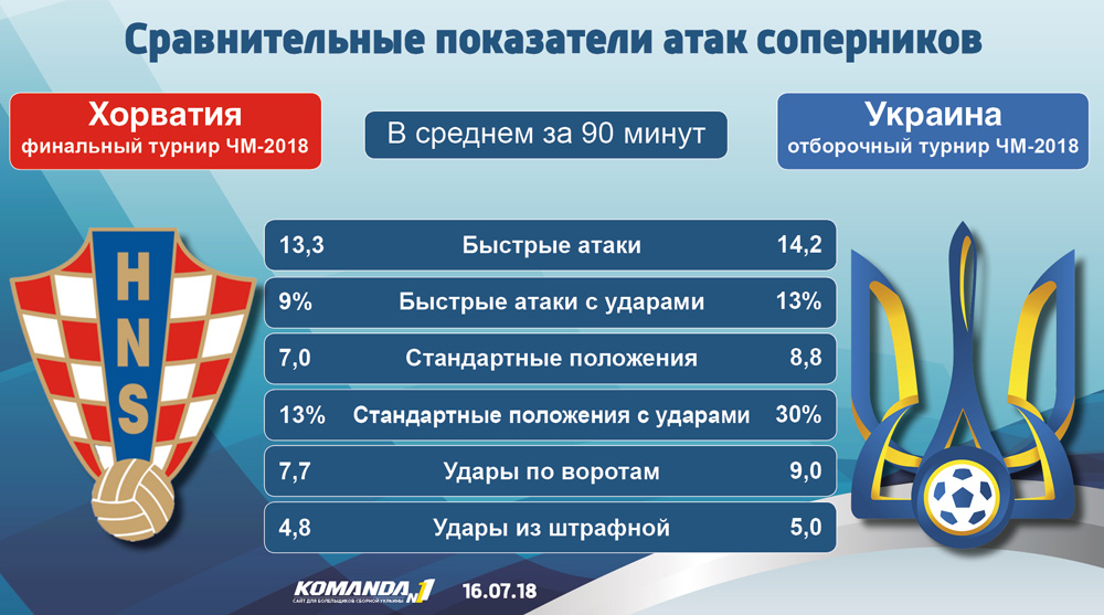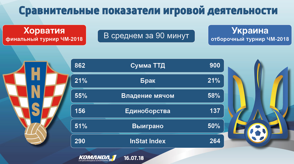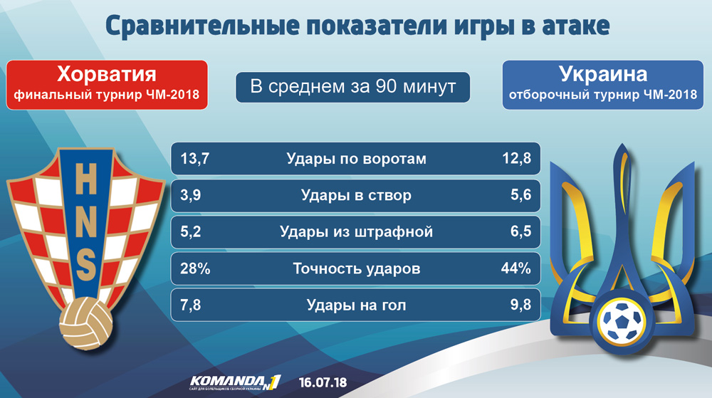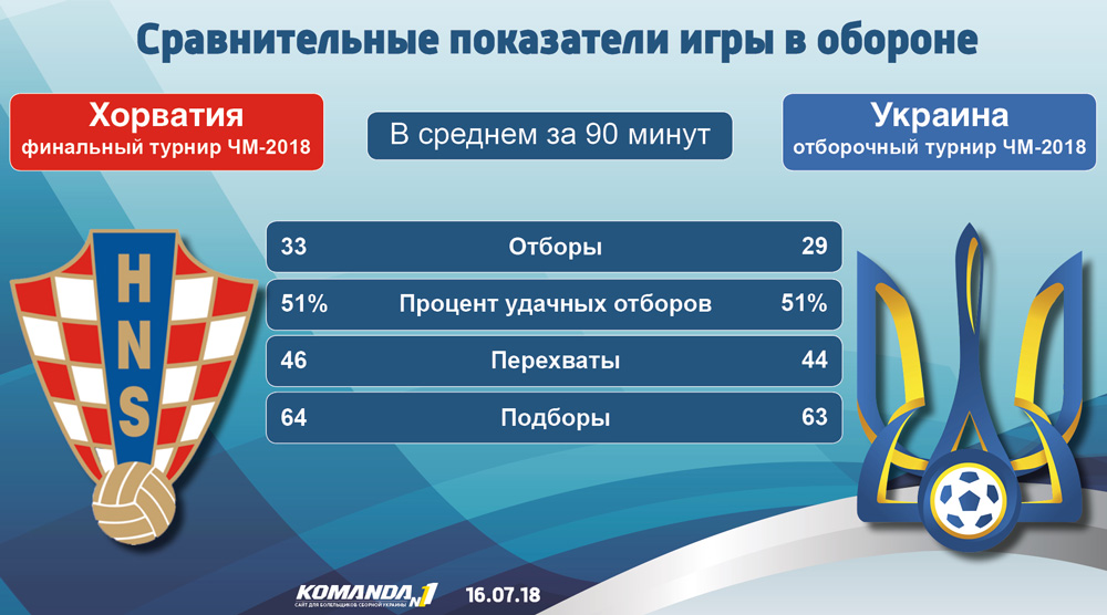 «У хорватов очень сбалансированный коллектив — компактный во всех отношениях. Они хорошо прессингуют не только на своей половине поля, а атакуют тоже большими силами. Сейчас у них все хорошо сложилось. Там собраны футболисты, которые не ждут борьбы на поле — они ее постоянно ищут», — слова главного тренера сборной Украины Андрея Шевченко перед финалом чемпионата мира лучше всего характеризуют главное отличие между нами. Мы больше владеем мячом, но в этом компоненте хорваты уступают не сильно. Меньше 50% времени контроля у них было только в одной игре из семи — с Аргентиной (3:0). Другое дело — борьба. А тут у клетчатых преимущество — в качестве и количестве (плюс 12 выигранных дуэлей за один матч).