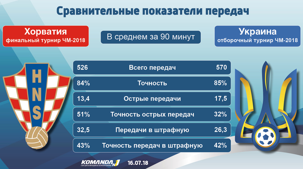 Передач у нас больше — это понятно. Но их характер существенно отличается. У хорватов, к примеру, в два раза больше контроля на чужой половине поля, но у нас не меньше острого паса. Вот только качество оставляет желать лучшего. А еще — разные источники этой продукции. Например, лидерами сборной Украины по количеству ключевых передач являются Евгений Коноплянка и Андрей Ярмоленко. У хорватов это Лука Модрич и Иван Ракитич. При этом у них тоже сильные фланги, в чем можно убедиться по доставке мяча в штрафную площадь. Значит, они просто разнообразнее. Но где нам взять Модрича и Ракитича? В Барселоне и в Реале они есть, а в Шахтере и Динамо пока отсутствует даже Брозович…